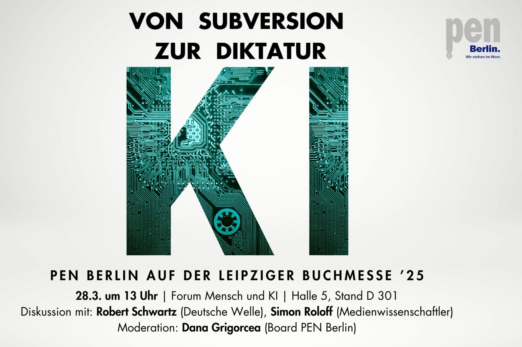 Zu diesem Panel auf der Centre Stage (Halle 4.1) laden wir Sie ebenso herzlich ein wie zu den acht weiteren Veranstaltungen, die am Stand von PEN Berlin (3.1 H34) stattfinden. Dort treten u.a. auf: der Prix Goncourt-Preisträger Kamel Daoud, der Soziologe Harald Welzer, der Psychologe Stephan Grünewald sowie die PEN-Berlin-Gründungsmitglieder Christian Berkel und Michel Friedman.