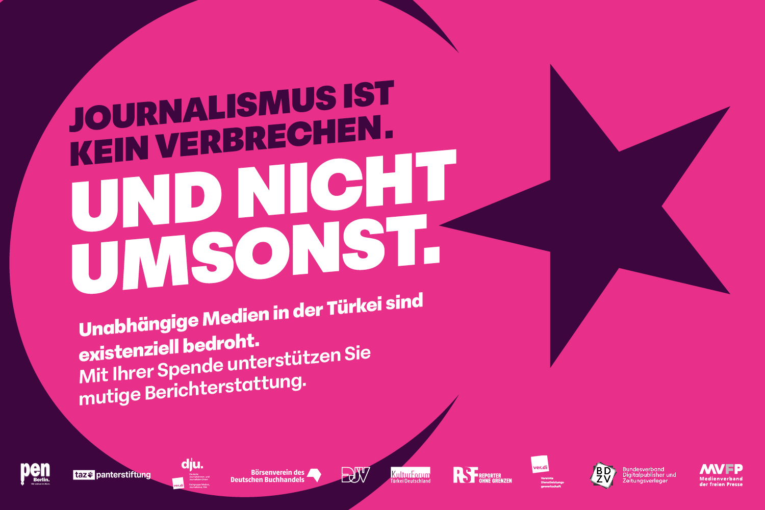 Darum startet PEN Berlin mit Unterstützung des Börsenvereins des Deutschen Buchhandels, des Bundesverbands Digitalpublisher und Zeitungsverleger (BDZV), des Deutschen Journalisten-Verbands (DJV), der Deutschen Journalistinnen- und Journalisten-Union (dju) in ver.di, des KulturForums TürkeiDeutschland, des Medienverbands der freien Presse (MVFP), Reporter ohne Grenzen (RSF), der taz Panter Stiftung und der Gewerkschaft ver.di diese Spendenkampagne für unabhängige Medien in der Türkei.